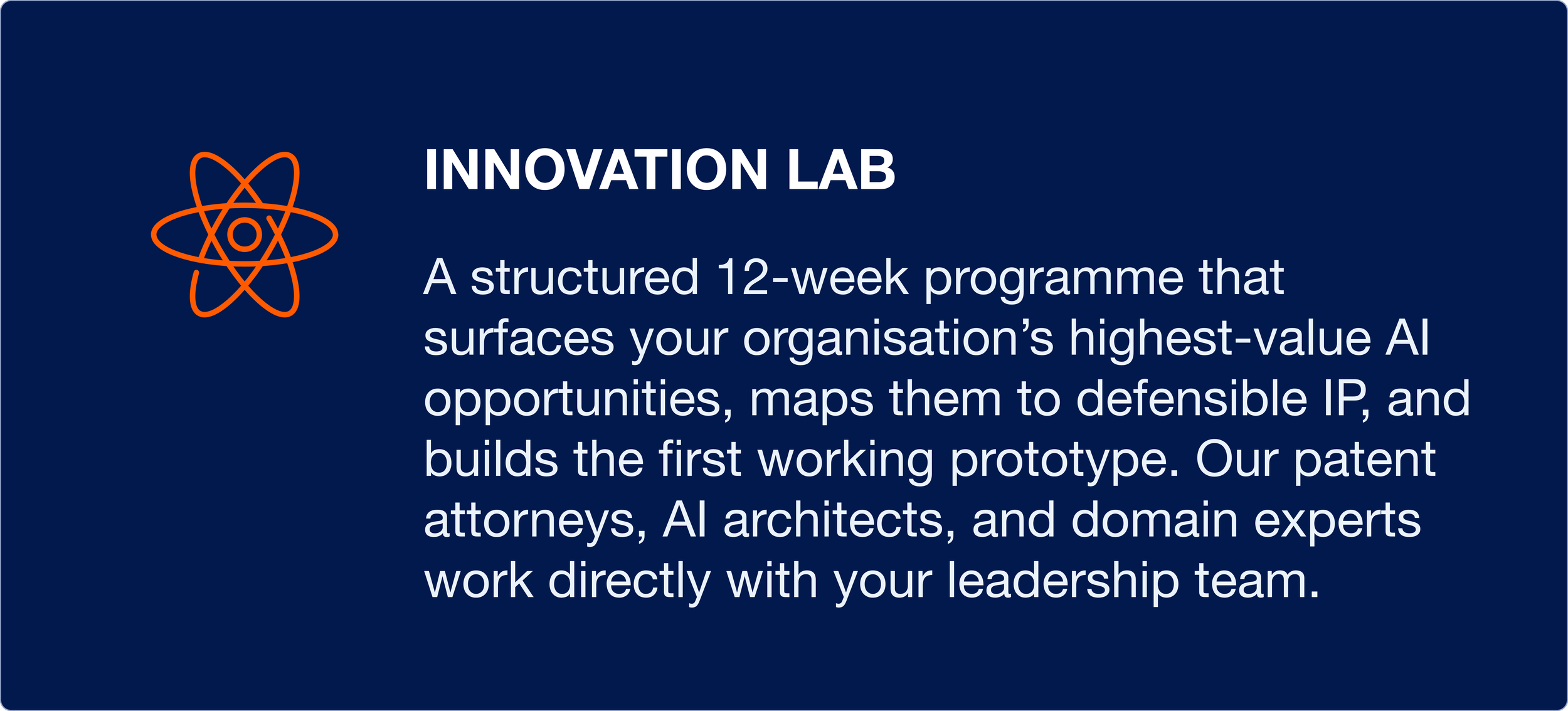 Agentic Shield is a 12-week programme that patents your AI, builds your innovation lab, and maps your roadmap. No IT required.